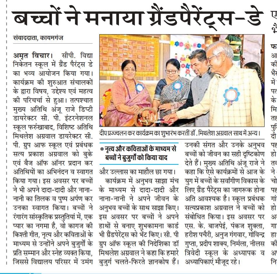 75th Anniversary of Republic day Day was celebrated on 26 January 2024 from 10:30 a.m. onwards in C.P.V.N. Campus. Flag Hoisting Ceremony was graced by our Executive Members of the Management Committee i.e. Dr. (Mrs.) Mithlesh Agarwal, & Mr. S. P. Agarwal Manager of C. P. Group of Schools. After Flag hoisting ceremony cultural programmes started. Including group song, group dance , speeches by students both in English and Hindi. Dr. (Mrs.) Mithlesh Agarwal, Director of C. P. Group of Schools addressed the assembly and motivated all to be disciplined and she also emphasized on cleanness.